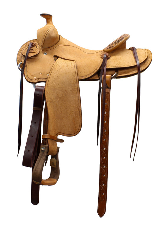 Here's an Oliver Saddle that sits on a Tascosa tree, 13 1/2" swell, 3 1/2" cantle, with a 3 1/4" x 2 1/4" TD horn. This saddle is a seat rig with a fishscale tooled cantle binding and it has stainless hardware.